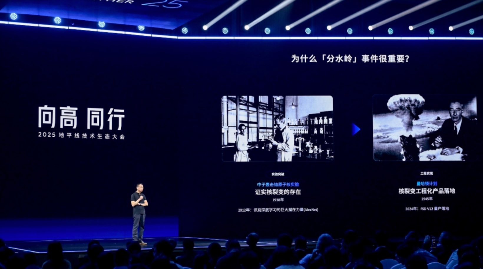 为什么说这是一个分水岭事件?举一个例子,在原子时代,第一个发现核裂变是可能的,而且是能释放能量的,是德国科学家,当时这个实验结果出来以后,全世界所有从事量子物理的科学家们都认为是不可能的,但是迅速的实验复现证明这个观点是对的,是有结果的,然后又花了 N 年的时间,造出了第一颗原子弹。什么意思呢?大家会发现深度学习和神经网络就像当初的核裂变实验一样,它告诉你这个范式是可能的,能干什么。但是这个范式什么时候、以什么形式能够在自动驾驶里面,能把自动驾驶做到多好,在第一人做到之前,没有人知道 yes or no,也不知道百分比,而 V12 让大家看到了这个希望。奥本海默最重要的是证明了原子弹是可以造出来的。